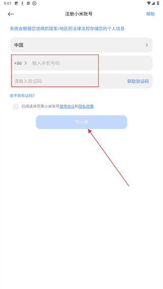 4、輸入注冊的手機(jī)號(hào)、驗(yàn)證碼,再點(diǎn)擊下一步即可注冊成功。