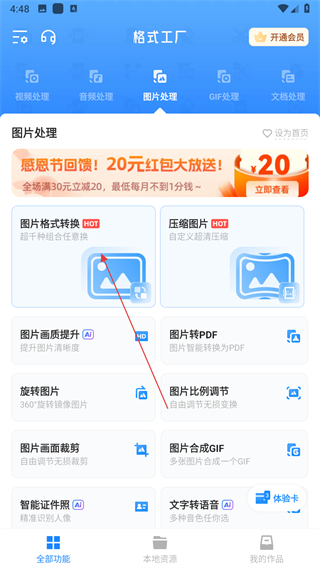 1、打開格式工廠應(yīng)用,在圖片處理頁面里,點擊圖片格式轉(zhuǎn)換。