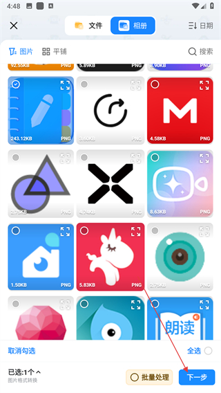 2、進入文件選擇界面,勾選需要轉(zhuǎn)換格式的圖片后,點擊下一步。