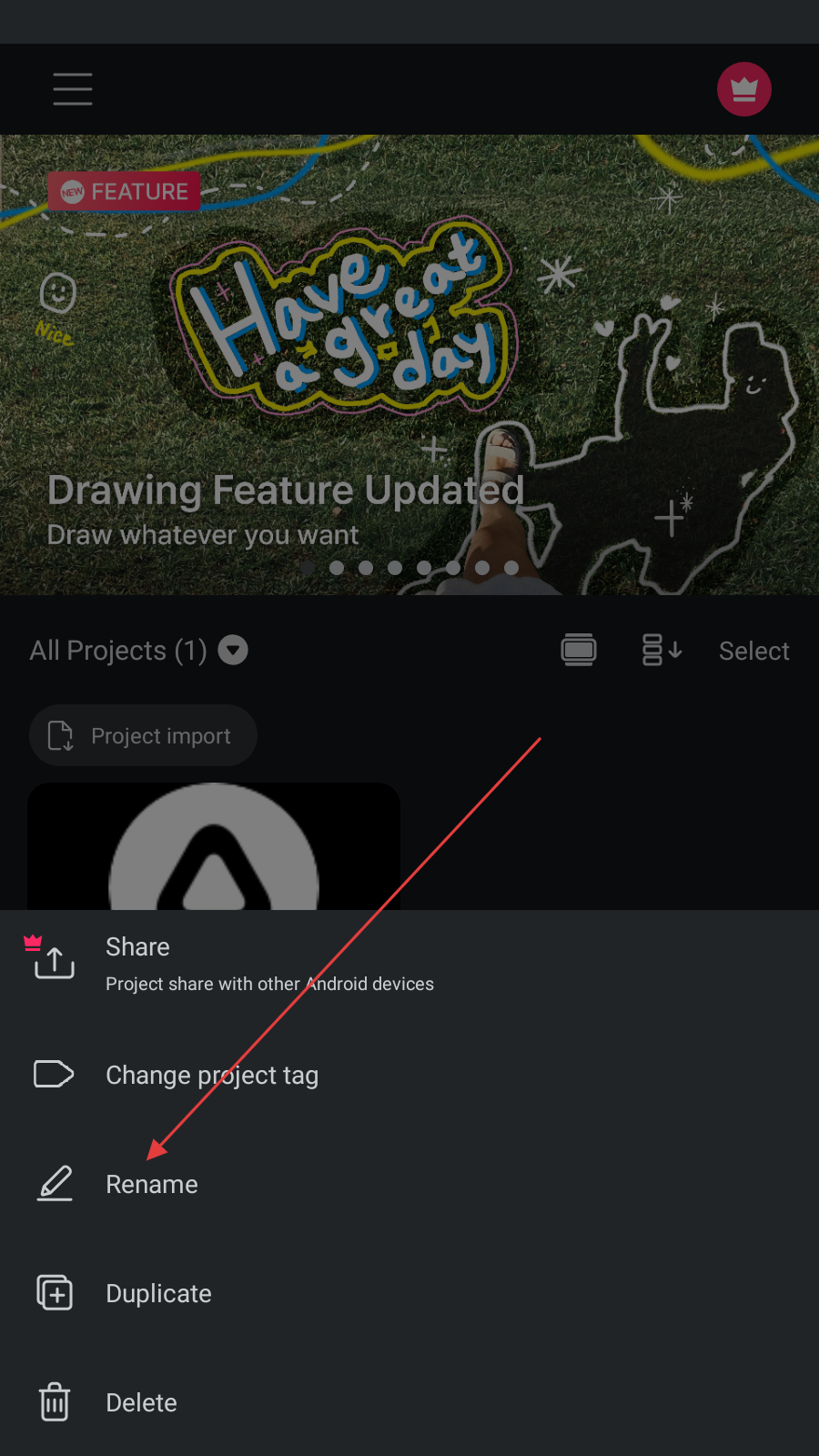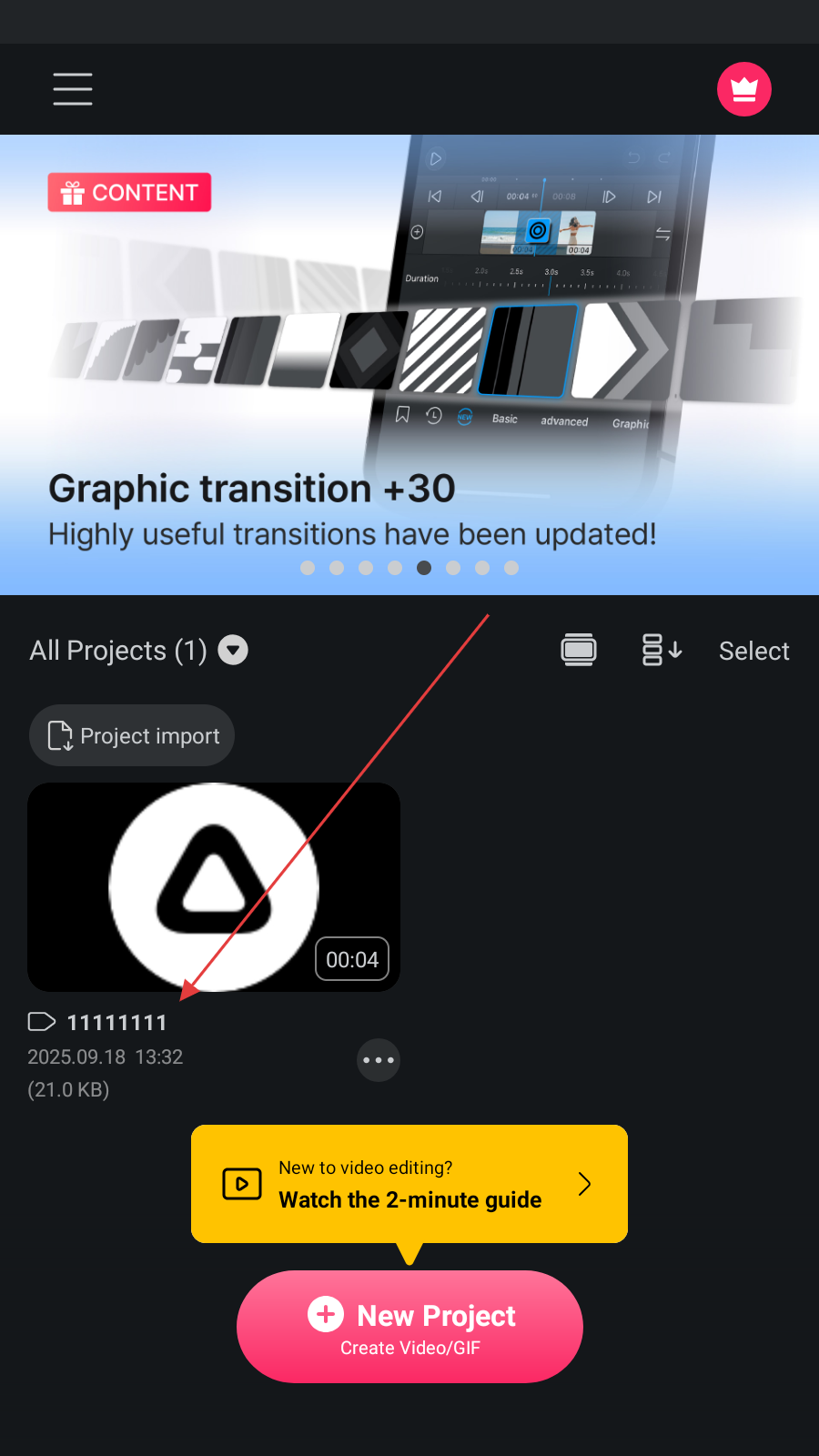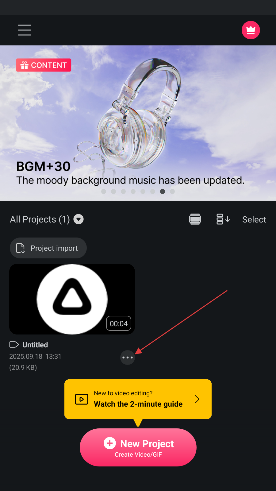1、打開VLLO軟件,在項(xiàng)目列表里找到需重命名的項(xiàng)目,點(diǎn)擊該項(xiàng)目右下角的三個(gè)點(diǎn)圖標(biāo)。