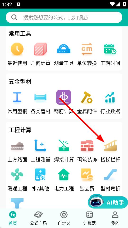 2、在首頁的工程計算板塊里,找到并點擊樓梯欄桿選項。