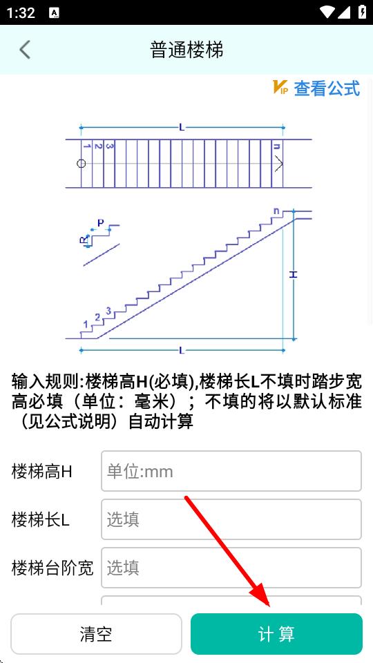 4、進入所選樓梯類型頁面,根據(jù)頁面提示,輸入相關(guān)參數(shù),比如樓梯高H等部分參數(shù)選填,輸入完成后點擊計算按鈕,即可得出計算結(jié)果。