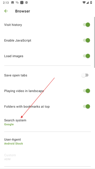 3、在Browser設置頁面里,找到Search system選項并點擊。
