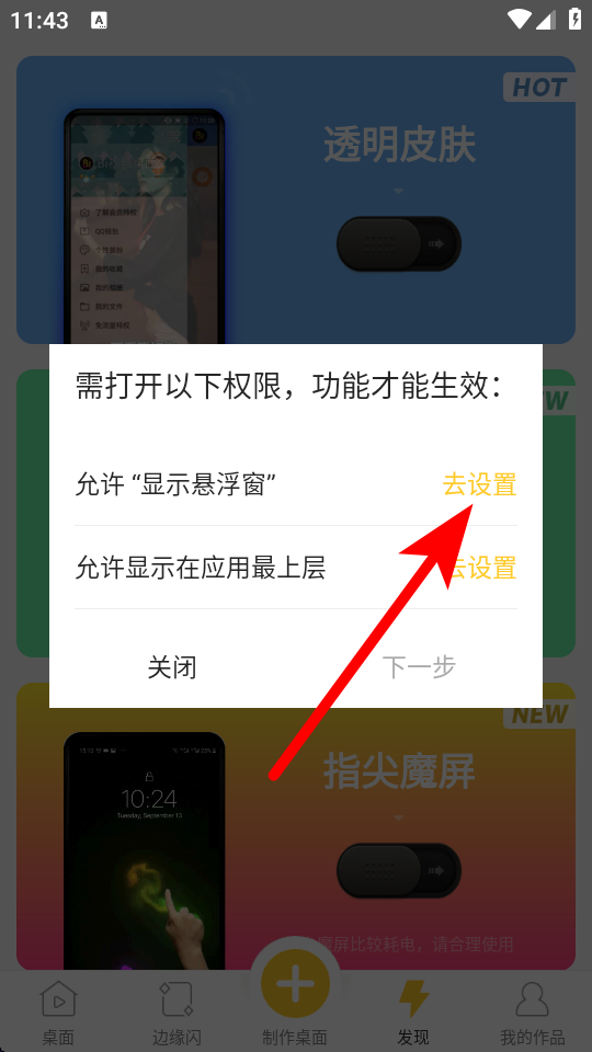 2、在權(quán)限設(shè)置提示中,點(diǎn)擊顯示懸浮窗后的去設(shè)置選項(xiàng),進(jìn)入權(quán)限設(shè)置頁(yè)面。