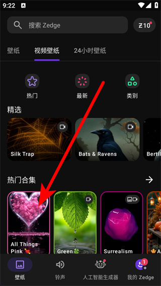 1、在Zedge首頁,點(diǎn)擊視頻壁紙選項(xiàng),進(jìn)入視頻壁紙分類頁面。