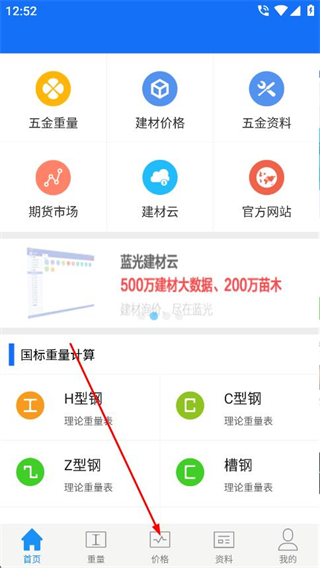 1、打開藍(lán)光五金手冊,點(diǎn)擊底部導(dǎo)航欄的價格選項。