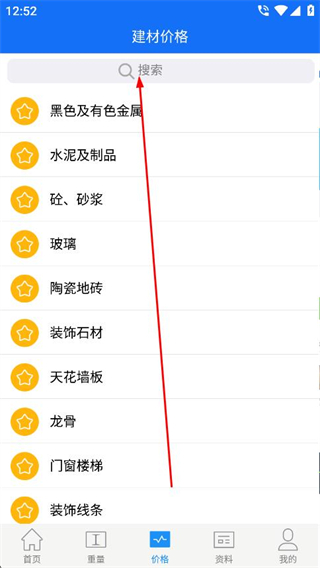 2、在建材價格頁面中,點(diǎn)擊搜索框,進(jìn)入搜索頁面。