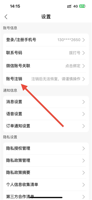 3、在設(shè)置頁面點(diǎn)擊賬號(hào)注銷選項(xiàng),進(jìn)入賬號(hào)注銷頁面。
