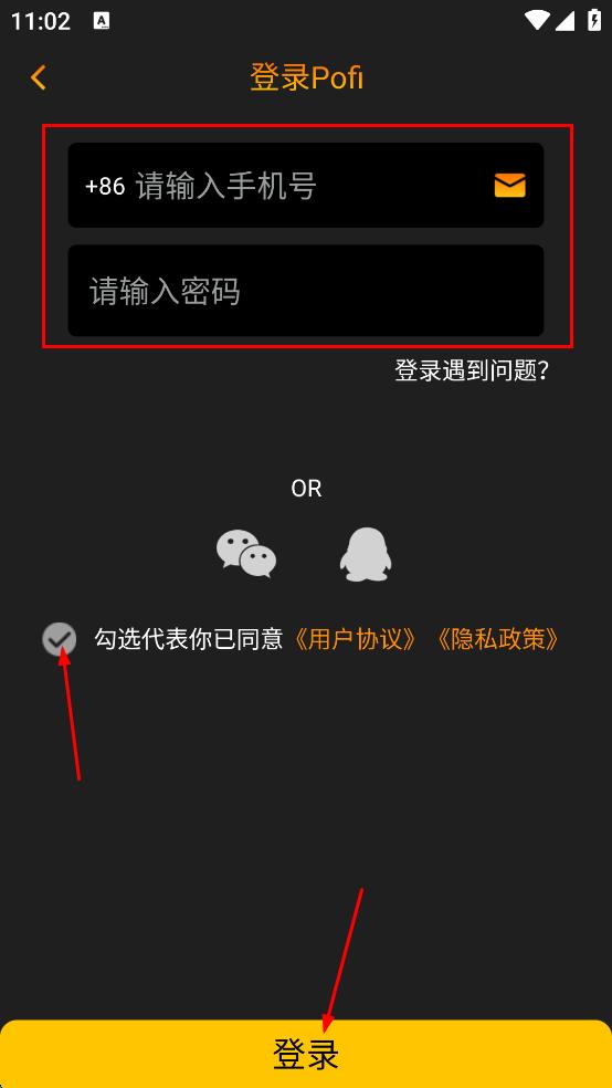 4、輸入手機(jī)號(hào)和密碼并勾選同意用戶協(xié)議和隱私政策,點(diǎn)擊登錄按鈕。