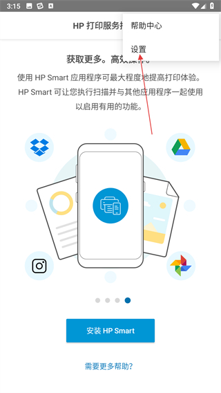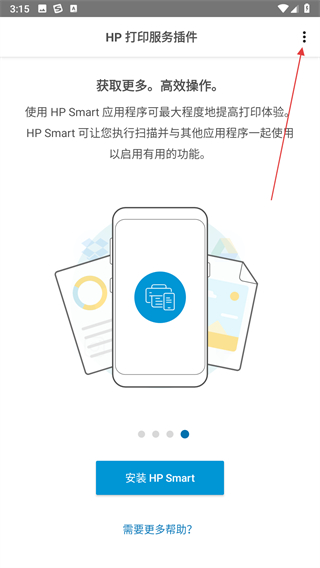 1、打開HP打印服務插件應用,點擊右上角的三點菜單圖標。