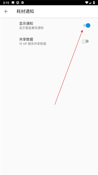 4、在耗材通知頁面,找到顯示通知選項,將開關關閉即可。