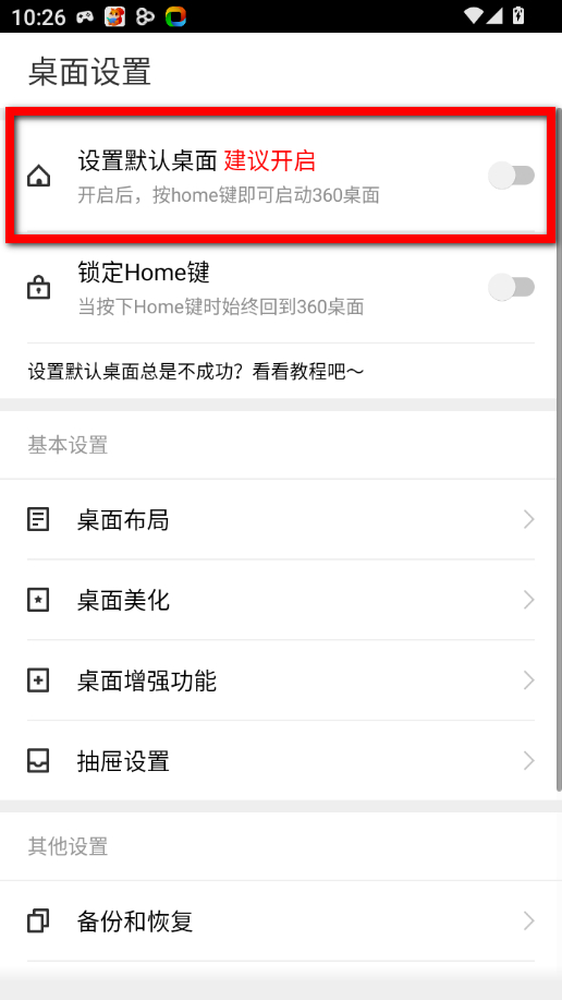3、在桌面設置頁面,找到設置默認桌面選項,將其開關開啟。