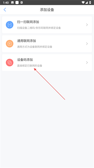 2、在添加設備頁面,點擊設備碼添加選項,進入綁定界面。