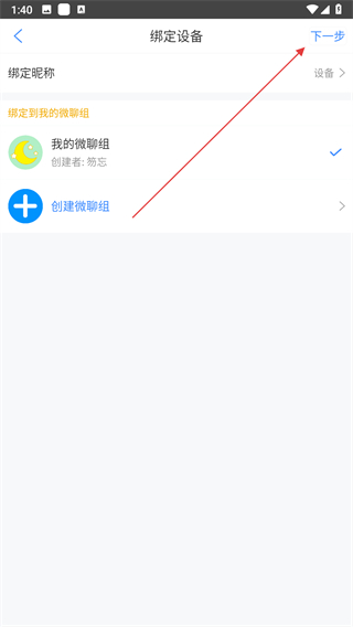 3、進入綁定設備頁面后,點擊右上角下一步按鈕。