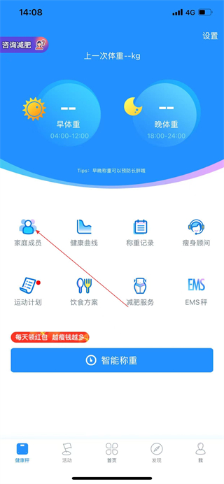 1、打開多銳APP,在健康秤頁面點(diǎn)擊家庭成員,進(jìn)入家庭成員頁面。