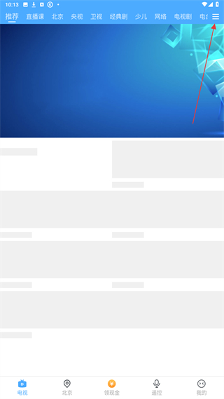 1、啟動(dòng)電視家的APP,進(jìn)入首頁(yè)點(diǎn)擊右上角三個(gè)橫線的圖標(biāo)。