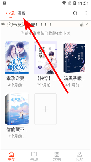 3、進(jìn)入追書大全主界面,界面有“小說”“漫畫”等分類,還有書架展示已收藏小說,在書架中找到想要閱讀的小說,點(diǎn)擊該小說封面。