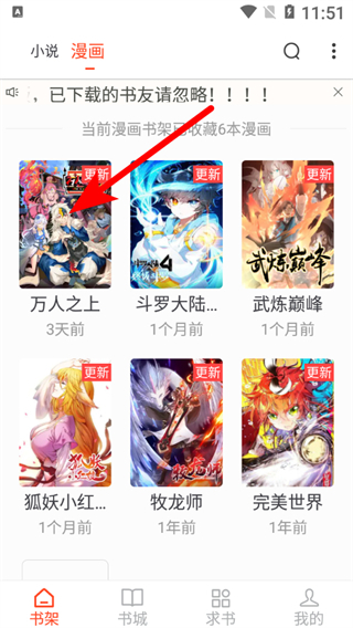2、在漫畫書架界面,選擇要分享的漫畫,進(jìn)入漫畫閱讀界面。