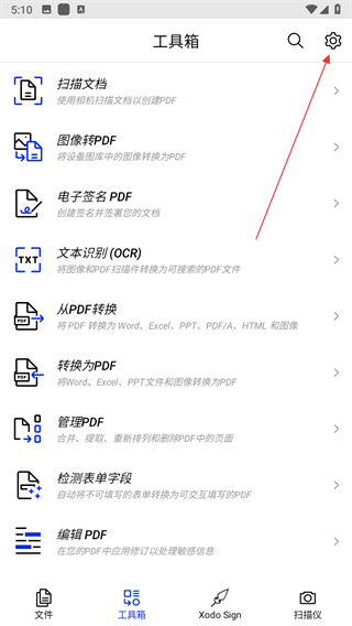 1、打開Xodo應(yīng)用,進(jìn)入工具箱界面,點擊右上角的設(shè)置圖標(biāo)。