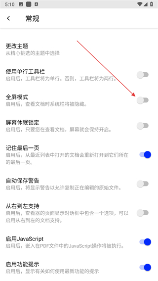4、在常規(guī)設(shè)置頁面中,找到全屏模式選項,點擊其右側(cè)的開關(guān)按鈕。