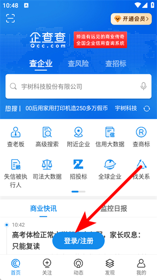1、打開企查查APP,在首頁(yè)點(diǎn)擊登錄/注冊(cè)按鈕,進(jìn)入登錄的界面。