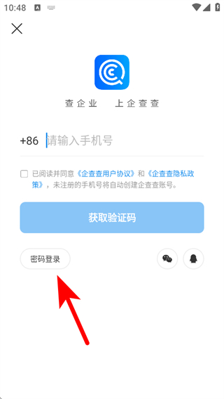 2、在登錄界面,點(diǎn)擊密碼登錄的選項(xiàng),顯示手機(jī)號(hào)和密碼輸入框。