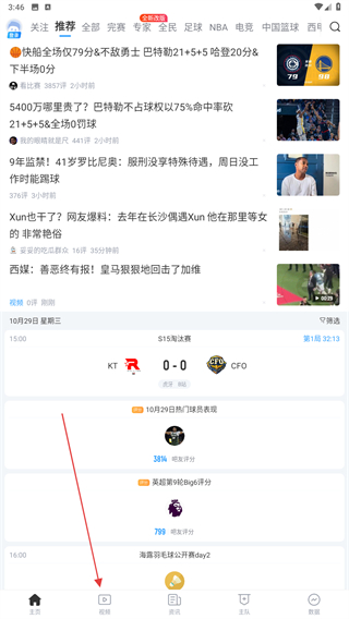 1、打開直播吧App,點擊底部導航欄中間的資訊圖標即可跳轉(zhuǎn)至該頁面。