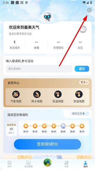1、打開最美天氣APP的軟件,進(jìn)入我的頁面,點(diǎn)擊右上角六邊形設(shè)置的圖標(biāo),進(jìn)入設(shè)置的界面。