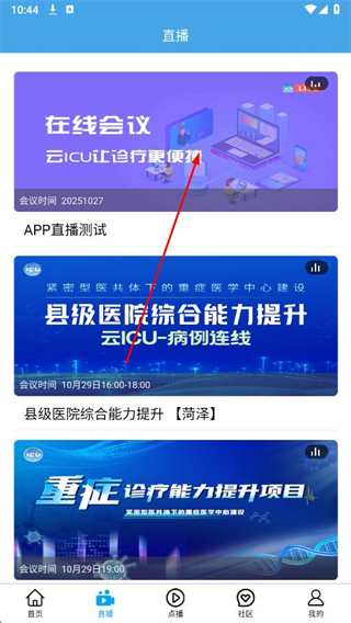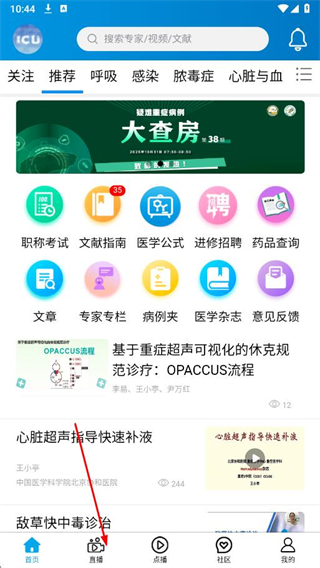 1、打開云ICU APP,點(diǎn)擊底部導(dǎo)航欄中的直播。