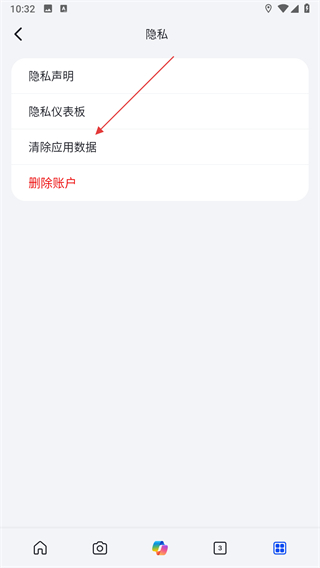 4、在隱私頁面,點(diǎn)擊清除應(yīng)用數(shù)據(jù)選項(xiàng)。