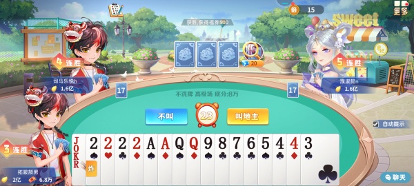 1、不洗牌斗地主是空間棋牌2025的一大特色玩法,節(jié)奏迅速,牌型多樣。在此玩法中,玩家需根據(jù)手牌情況搶叫地主。若手牌質(zhì)量較高,則可選擇主動(dòng)叫地主。