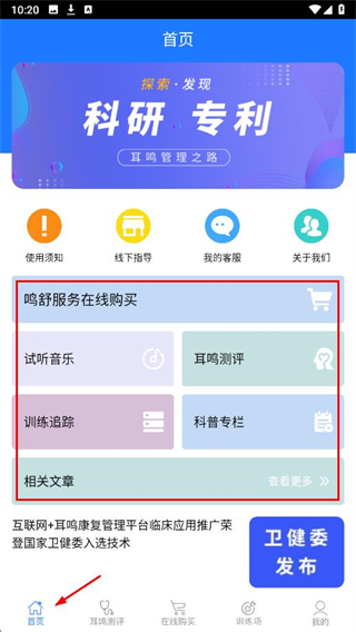 5、首頁(yè)有鳴舒服務(wù)在線(xiàn)購(gòu)買(mǎi)、試聽(tīng)音樂(lè)、科普專(zhuān)欄、相關(guān)文章等板塊,還有使用須知、線(xiàn)下指導(dǎo)、我的客服、關(guān)于我們等功能入口。