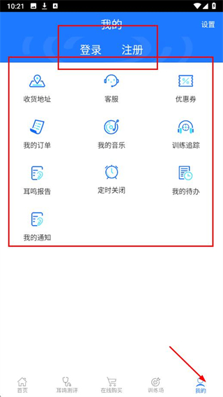 4、用戶(hù)可進(jìn)行登錄注冊(cè),管理收貨地址、客服咨詢(xún)、優(yōu)惠券使用,查看我的訂單、我的音樂(lè)、訓(xùn)練追蹤、耳鳴報(bào)告、定時(shí)關(guān)閉設(shè)置、我的待辦和我的通知等。