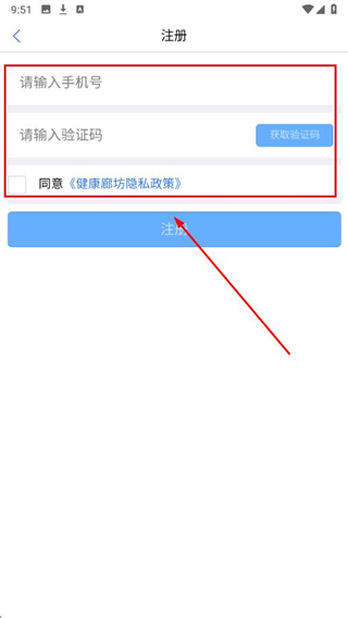 3、輸入手機(jī)號(hào)碼,并填入驗(yàn)證碼,勾選隱私政策,完成注冊(cè)流程。