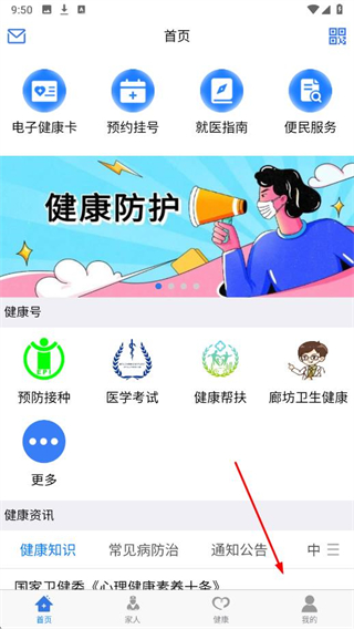 1、打開健康廊坊APP,點(diǎn)擊導(dǎo)航欄中的我的。