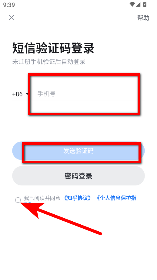 3、在短信驗(yàn)證碼登錄頁(yè)面,輸入手機(jī)號(hào),勾選同意協(xié)議后點(diǎn)擊發(fā)送驗(yàn)證碼。