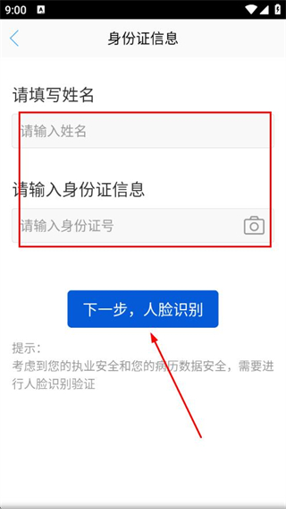 4、在身份證信息頁(yè)面,填寫姓名和身份證號(hào),點(diǎn)擊下一步,人臉識(shí)別。