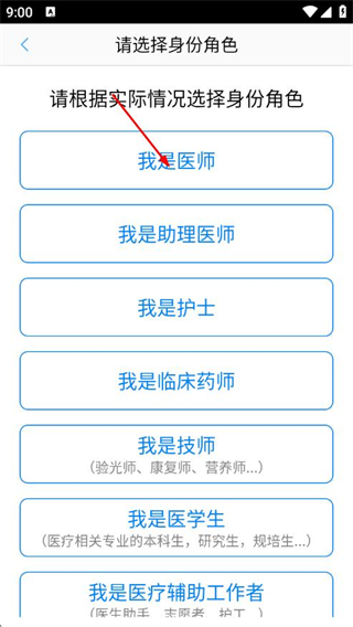 3、進(jìn)入身份角色選擇頁(yè)面,根據(jù)實(shí)際情況選擇身份,如我是醫(yī)師。