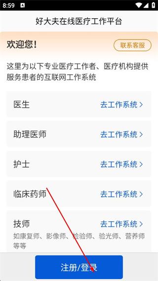 1、打開好大夫在線醫(yī)療工作平臺(tái),點(diǎn)擊注冊(cè)/登錄。