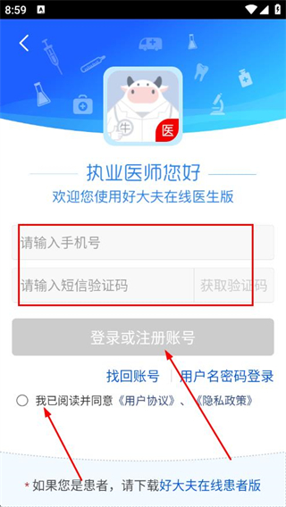 2、在登錄頁(yè)面輸入手機(jī)號(hào),點(diǎn)擊獲取驗(yàn)證碼并填入,勾選協(xié)議,點(diǎn)擊登錄或注冊(cè)賬號(hào)。