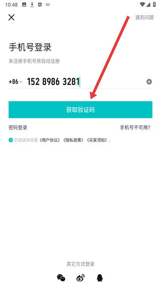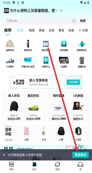 2、進入得物首頁后,點擊登錄挑選按鈕,即可進入手機號登錄頁面。