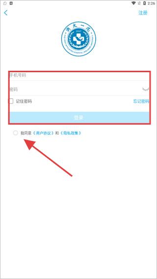 1、打開掌上浙一APP,先進(jìn)行登錄操作,輸入手機(jī)號(hào)碼和密碼,勾選用戶協(xié)議,點(diǎn)擊登錄。