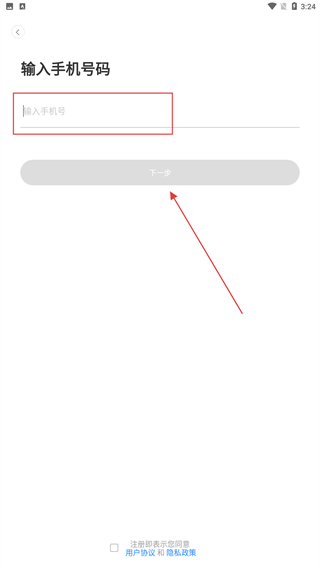 2、進(jìn)入注冊(cè)的頁(yè)面內(nèi),輸入手機(jī)號(hào)再點(diǎn)擊下一步。