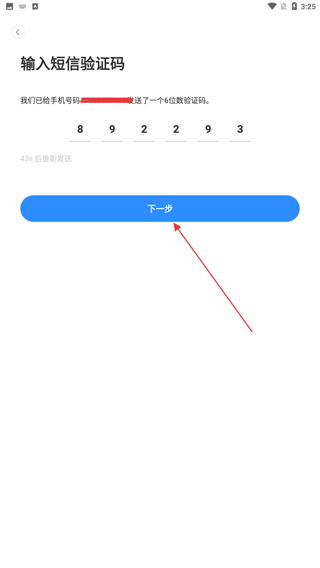 3、將收到的驗(yàn)證碼輸入其中,再點(diǎn)擊下一步的按鈕。