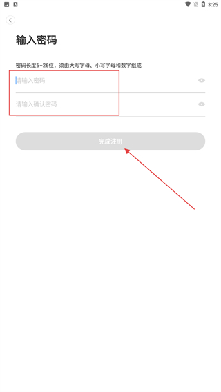 4、進(jìn)入最后一步,輸入密碼后點(diǎn)擊完成注冊(cè)即可。