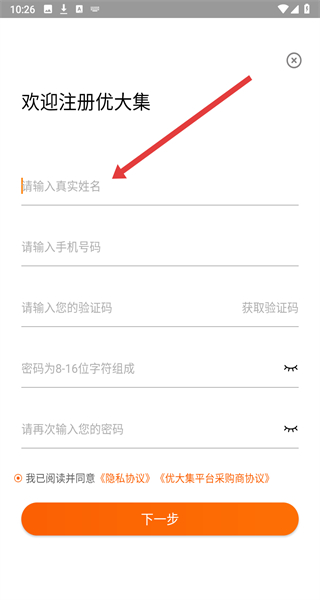 4、在注冊(cè)頁(yè)面依次輸入真實(shí)姓名、手機(jī)號(hào)碼,輸入驗(yàn)證碼,設(shè)置密碼并再次確認(rèn)密碼,點(diǎn)擊“下一步”完成賬號(hào)注冊(cè)。