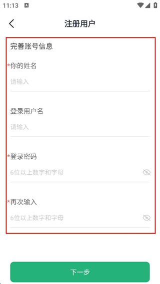 4、在完善賬號信息頁面輸入姓名、登錄用戶名、登錄密碼并再次輸入密碼,完成注冊流程。