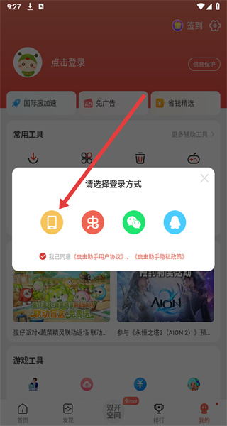 1、打開蟲蟲助手APP,進入我的頁面,通過點擊登錄,彈出請選擇登錄方式窗口。