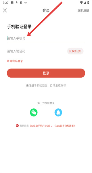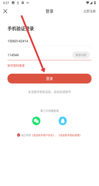 4、將收到的驗證碼填入下方輸入框,最后點擊登錄按鈕,完成蟲蟲助手的登錄操作。