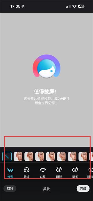 4、美妝效果調(diào)整完成后,點(diǎn)擊完成按鈕,再點(diǎn)擊右上角的保存按鈕,保存修圖后的照片。